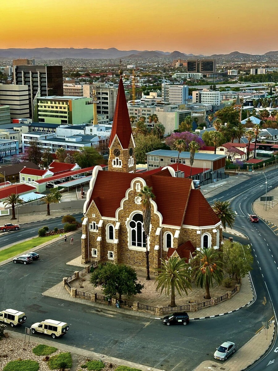Виндхук - столица Намибии и самый большой город страны, расположен на высоте 1650 метров над уровнем моря у подножья гор. Недаром с "африкаанс" город переводится как ветренный уголок. Но климат здесь довольно мягкий из-за своего расположения, здесь нет сильного зноя даже в летние месяцы. Виндхук долгое время был частью немецкой колонии и в нем до сих пор сохранились очертания нем. архитектуры начала 20 века. Т.к. все природные сокровища Намибии находятся за пределами столицы, мы останавливаемся здесь только для ночевки после перелета.